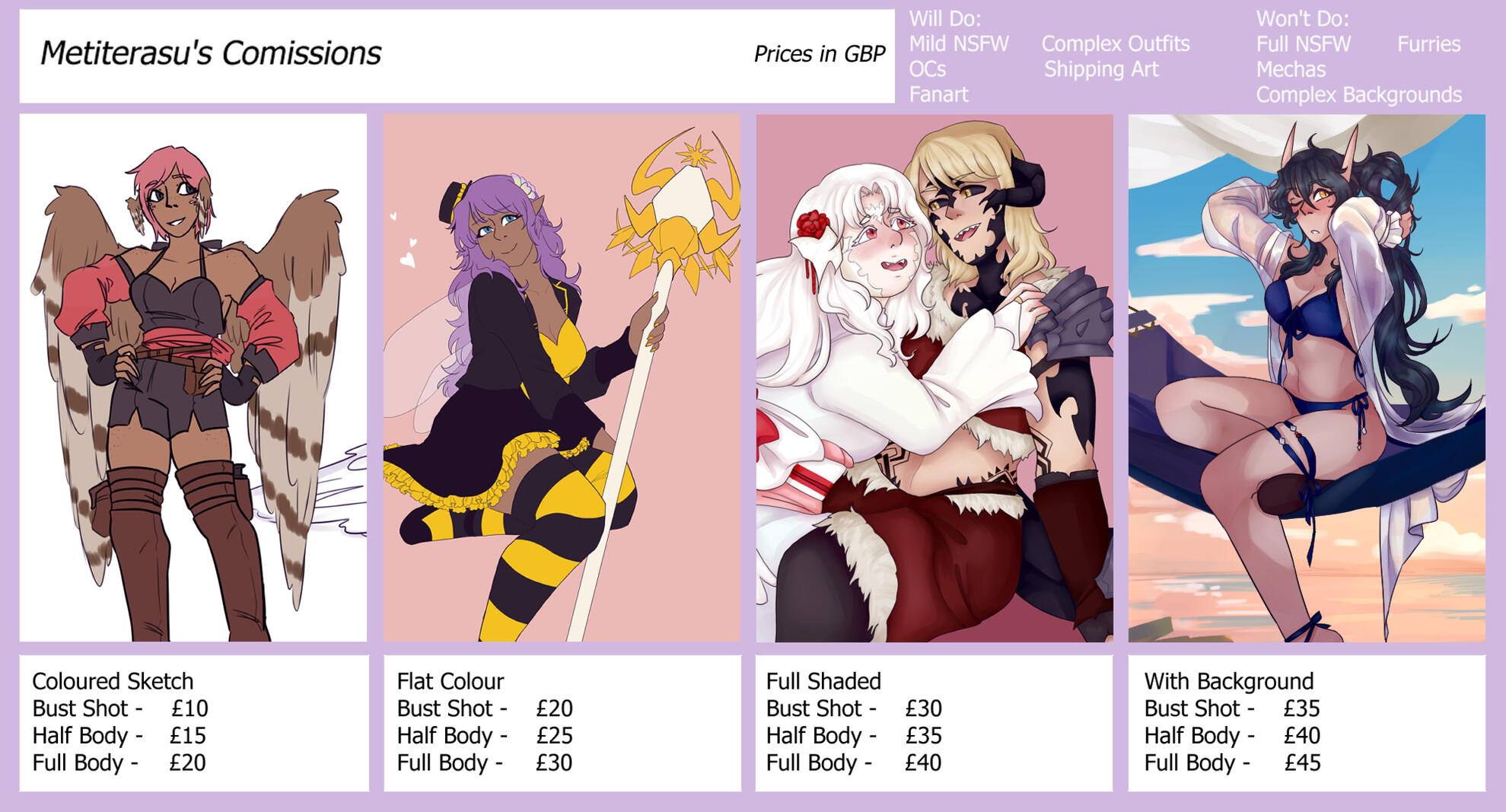 DM me on Twitter or Discord (mutuals can ask) if you want to discuss a commission, include which type, any reference images and any general ideas you have about poses or compositions if you want something specific.